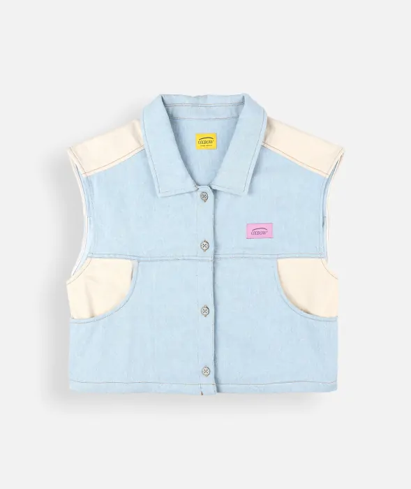 Comfortable and practical, this sleeveless denim jacket is perfect for casual days.