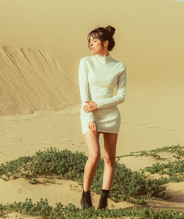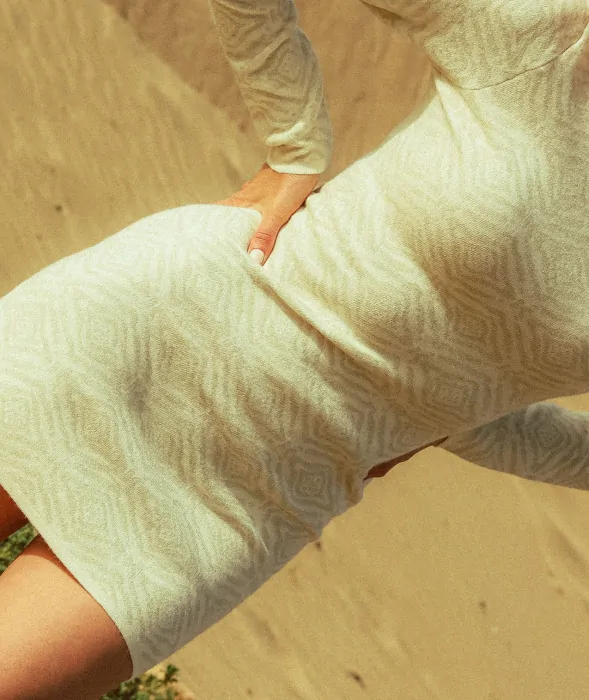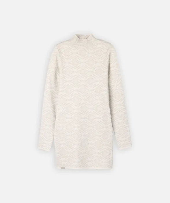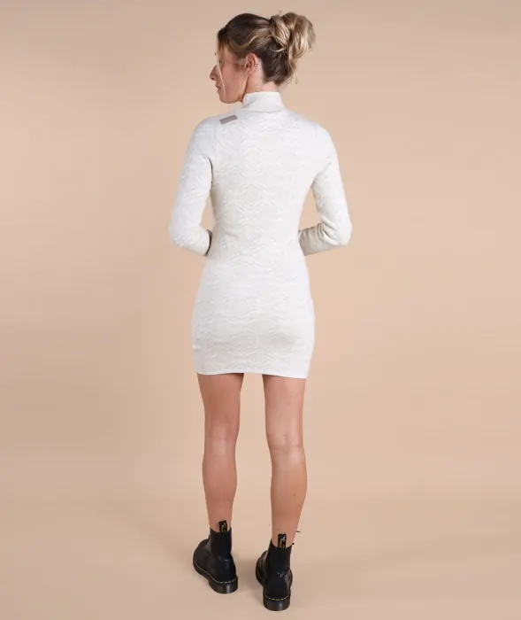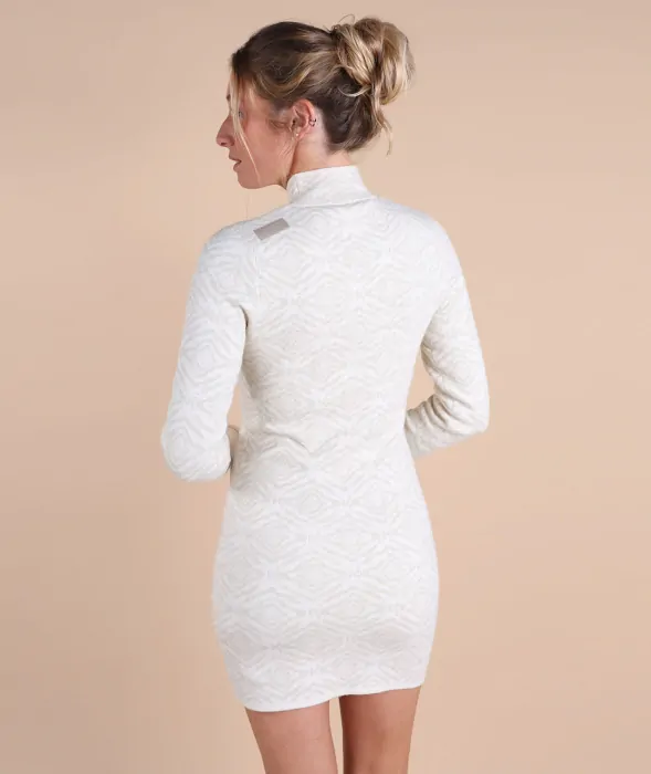 Body-hugging knit dress with jacquard artwork, perfect for an elegant and modern look.