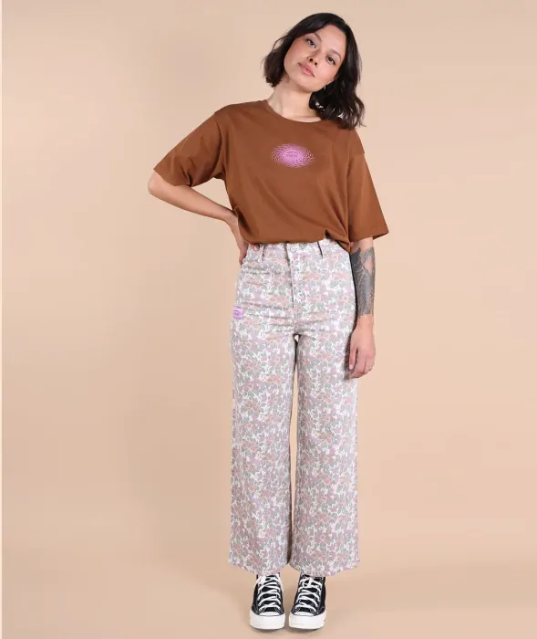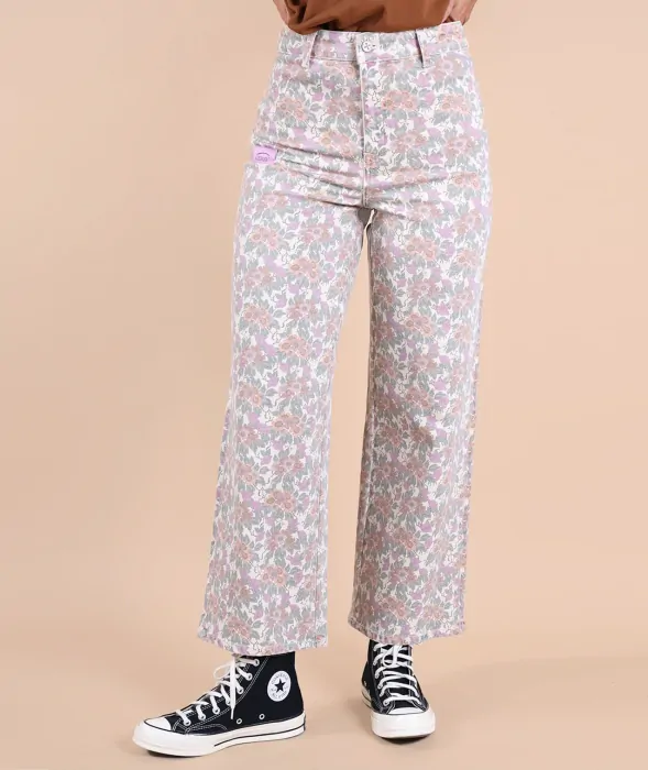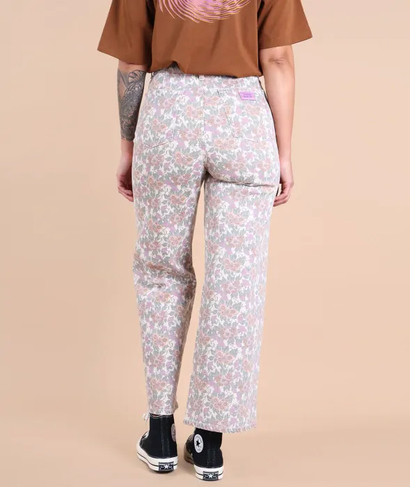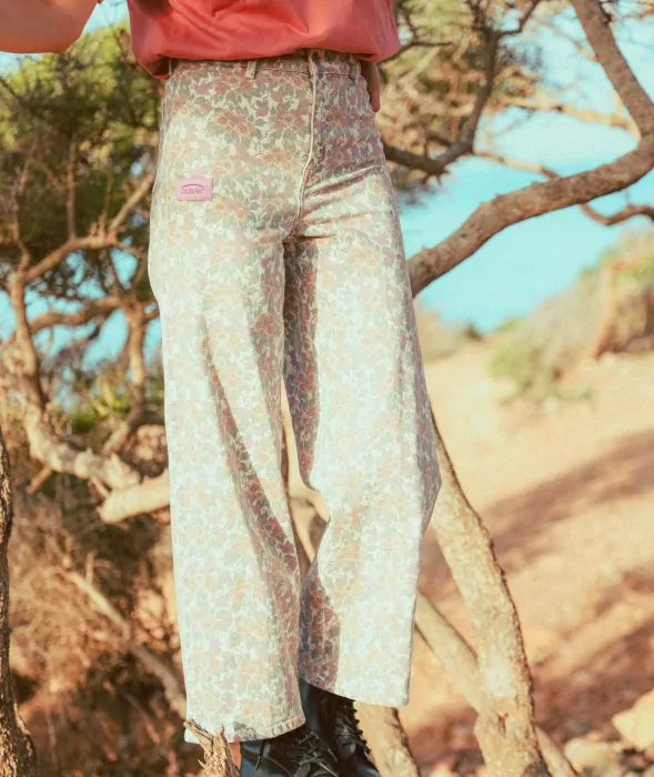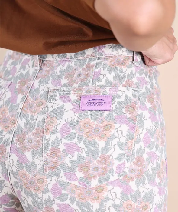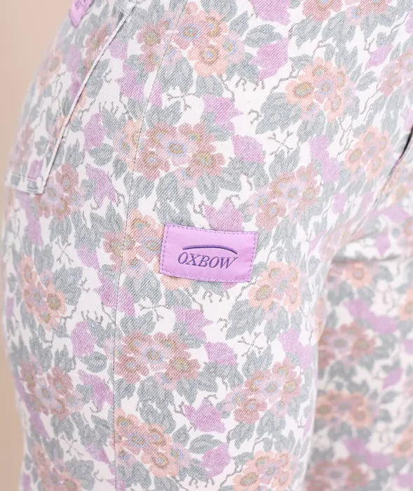 High-waist twill pants with all-over print, comfortable stretch material, and bold look.