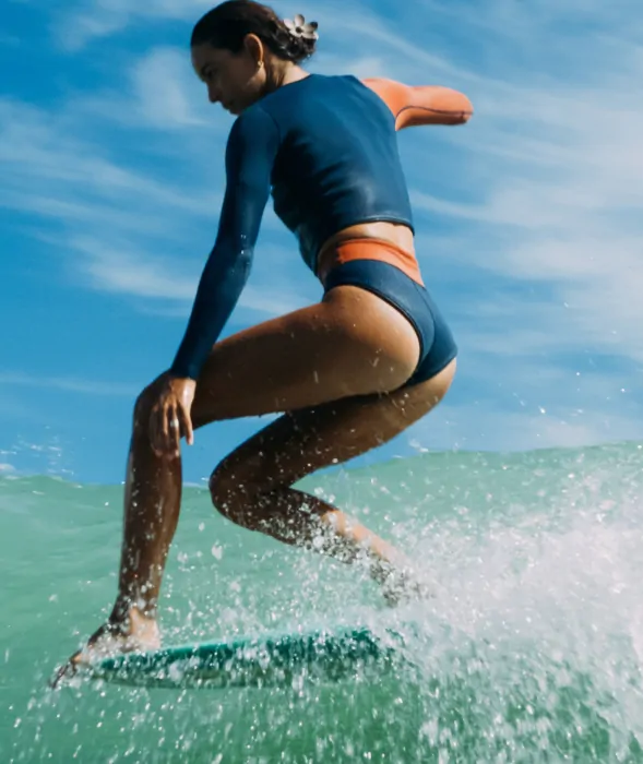 A true artist of classic longboarding, a discipline which bases its aesthetic philosophy on a permanent search between balance and imbalance, Laure Mayer found her perfect rhythm and lifestyle between Australia and the Basque Country. From one hemisphere to another, in search of endless summer, her passion for dance and fashion combines with her surf culture gives the tempo of this collection.