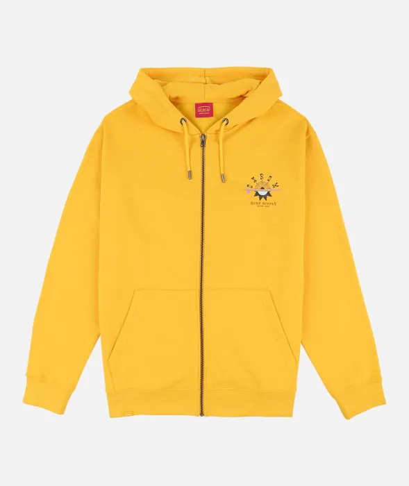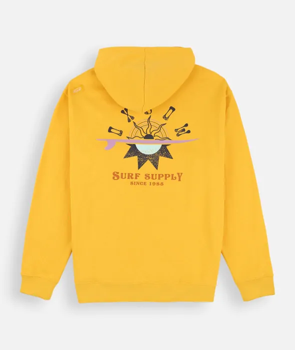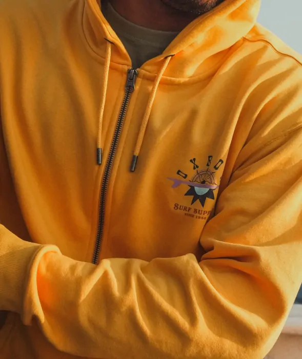 A zip-up sweatshirt with a surf-inspired graphic on the back.