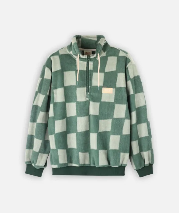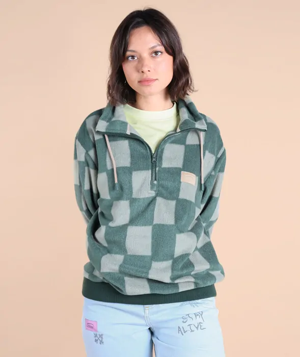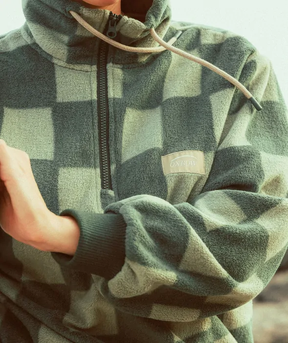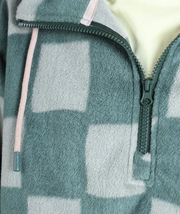 Bold-style half-zip printed fleece, drawstring collar, and gathered cuffs and waist.
