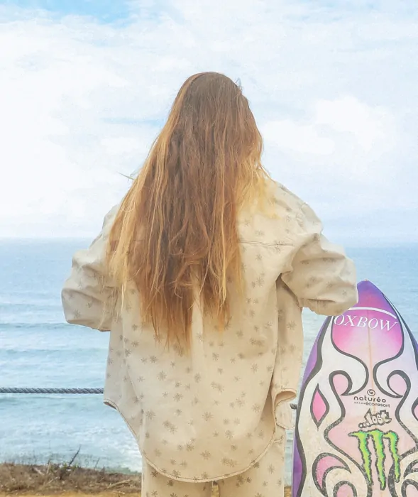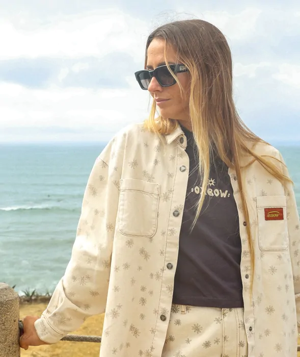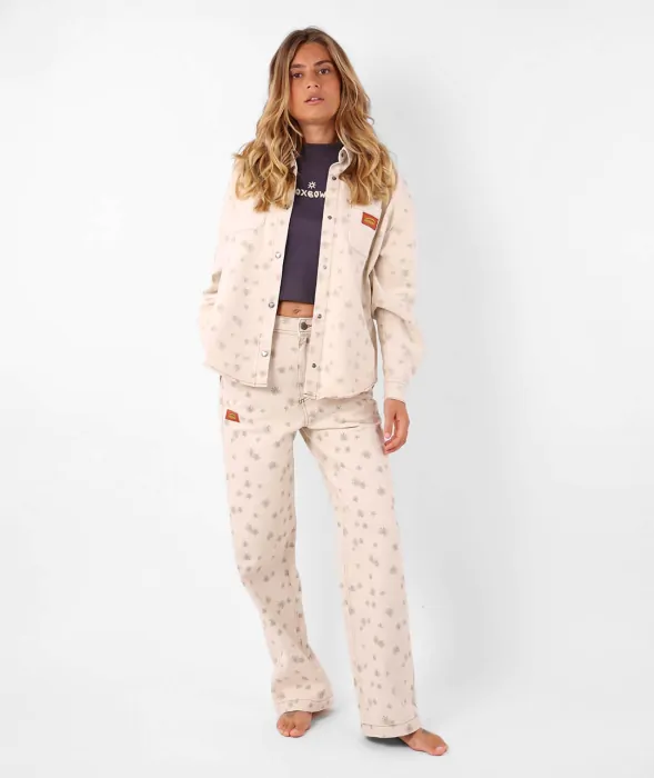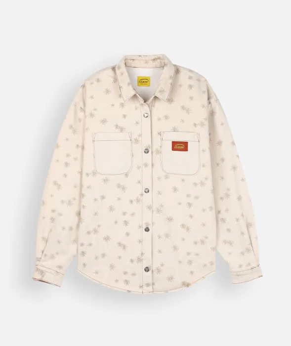 - Allover printed oversized denim shirt with background color contrast on pocketand collar