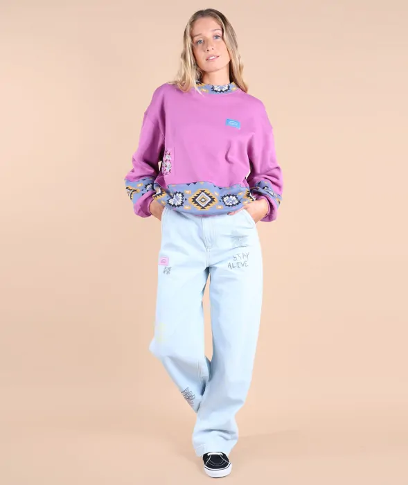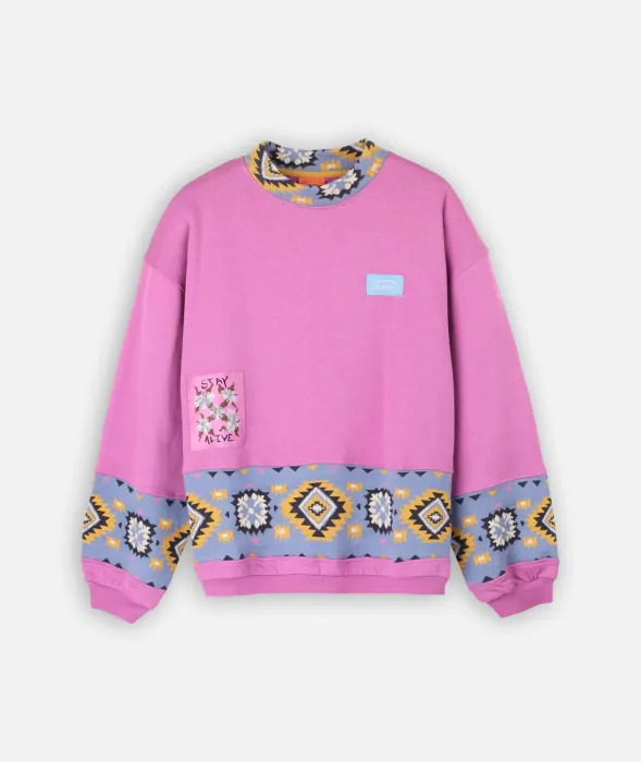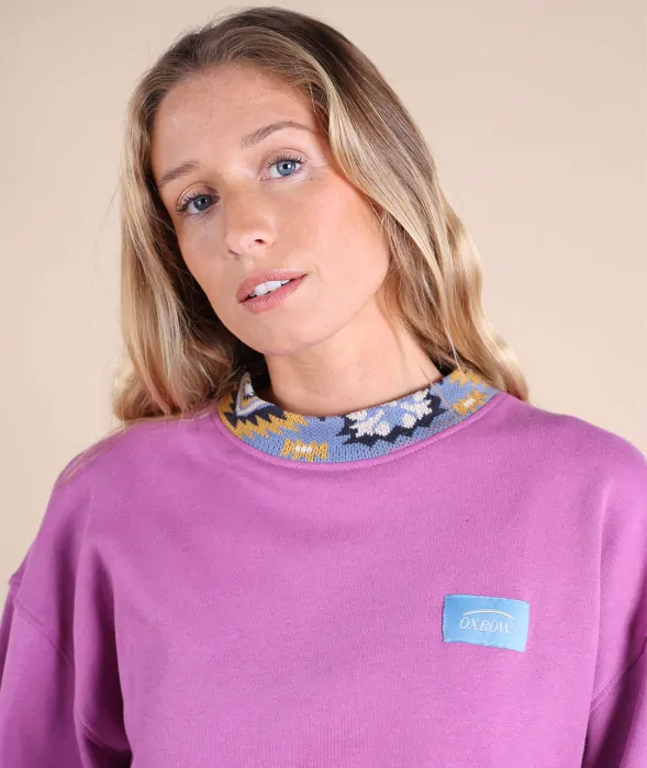 Cotton crewneck sweatshirt with side woven artwork label and integrated jacquard artwork on body and collar.